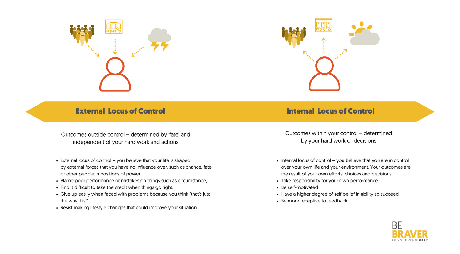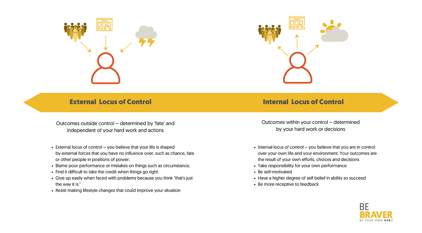 For Clients that tend to be over self critical, afford successes to others and failures become an all consuming reflection of the self, I find it very helpful to sit with the paradox of these two perspectives on where you think the locus of control falls heavier in given situations. To explore that in reality perhaps its not quite so cut and dried, black or white, me or other.