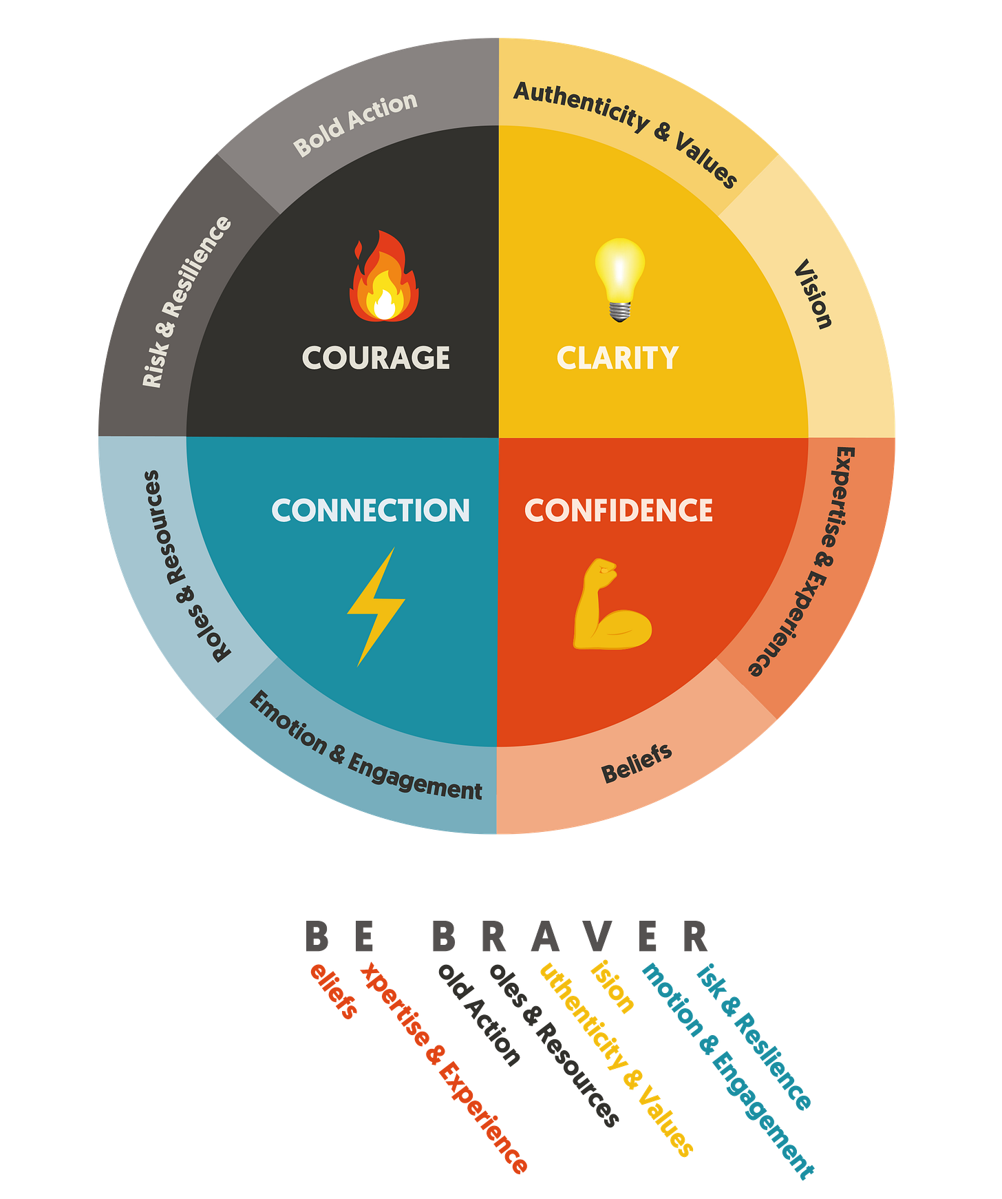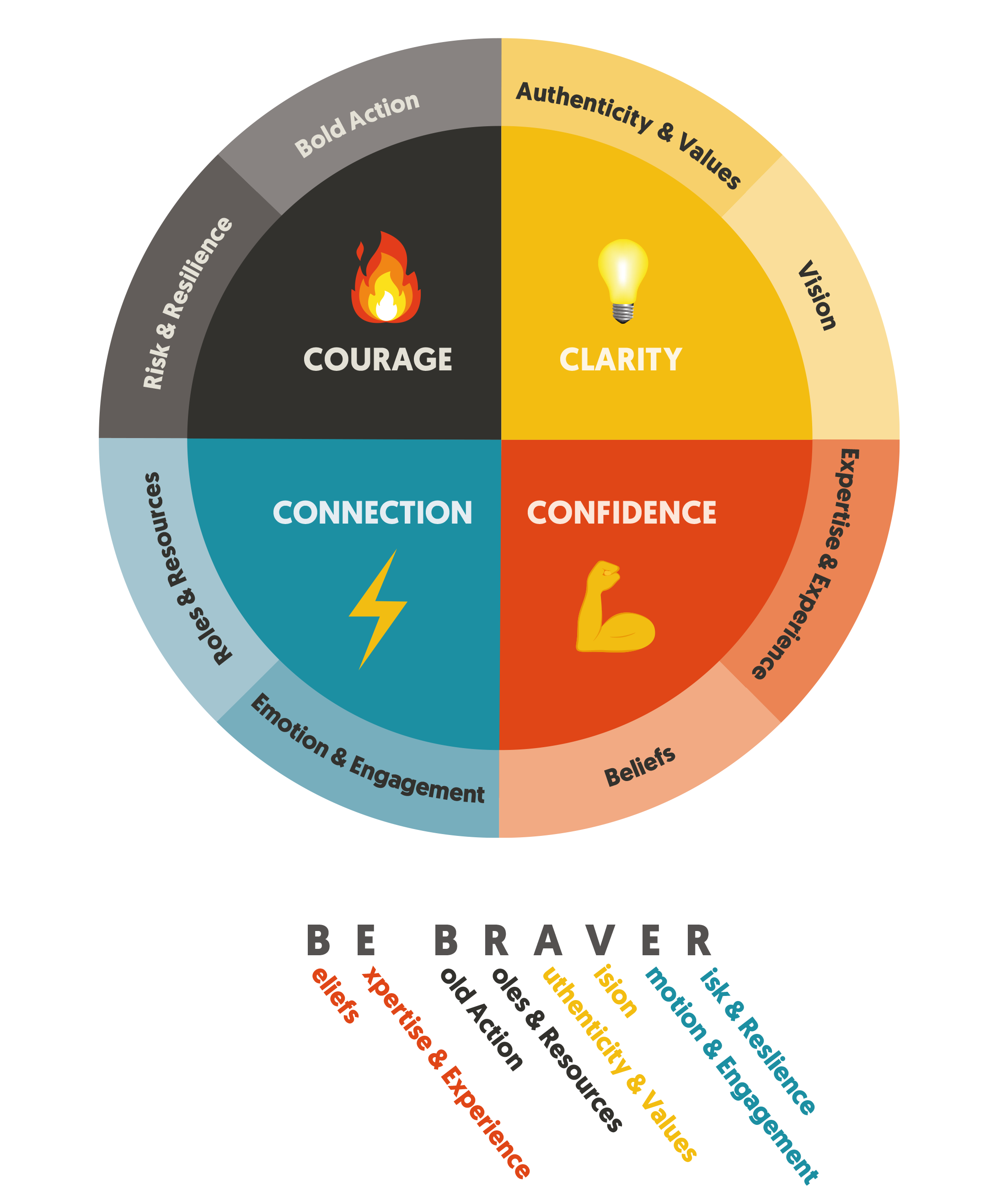 In Be Braver, when we choose courage, there is clarity, confidence and connection sitting behind that decision. In a sense, there is a preparedness for failure. We know exactly what purpose the decision serves, why we have motivation for doing it, what it says about the person we are becoming, the future we are creating. We know what is within our control and what is outside of our control. What is at stake in not risking failure.